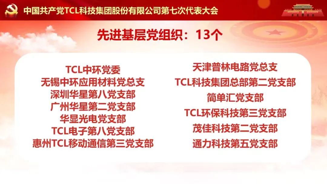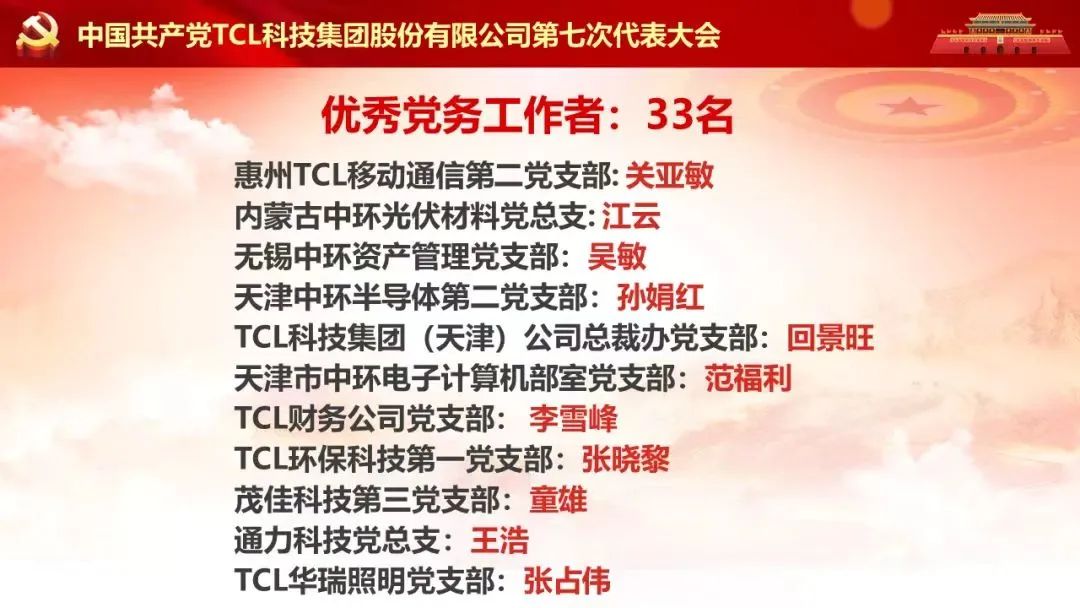 經(jīng)TCL科技(天津)公司黨委推薦,1個黨組織和12名優(yōu)秀黨務(wù)工作者和優(yōu)秀共產(chǎn)黨員受到TCL集團黨委表彰。