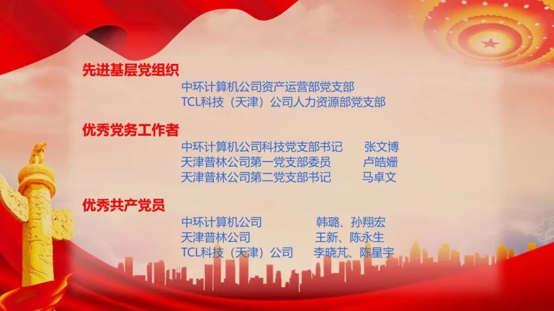 經(jīng)TCL科技(天津)公司黨委推薦,1個黨組織和12名優(yōu)秀黨務(wù)工作者和優(yōu)秀共產(chǎn)黨員受到TCL集團黨委表彰。